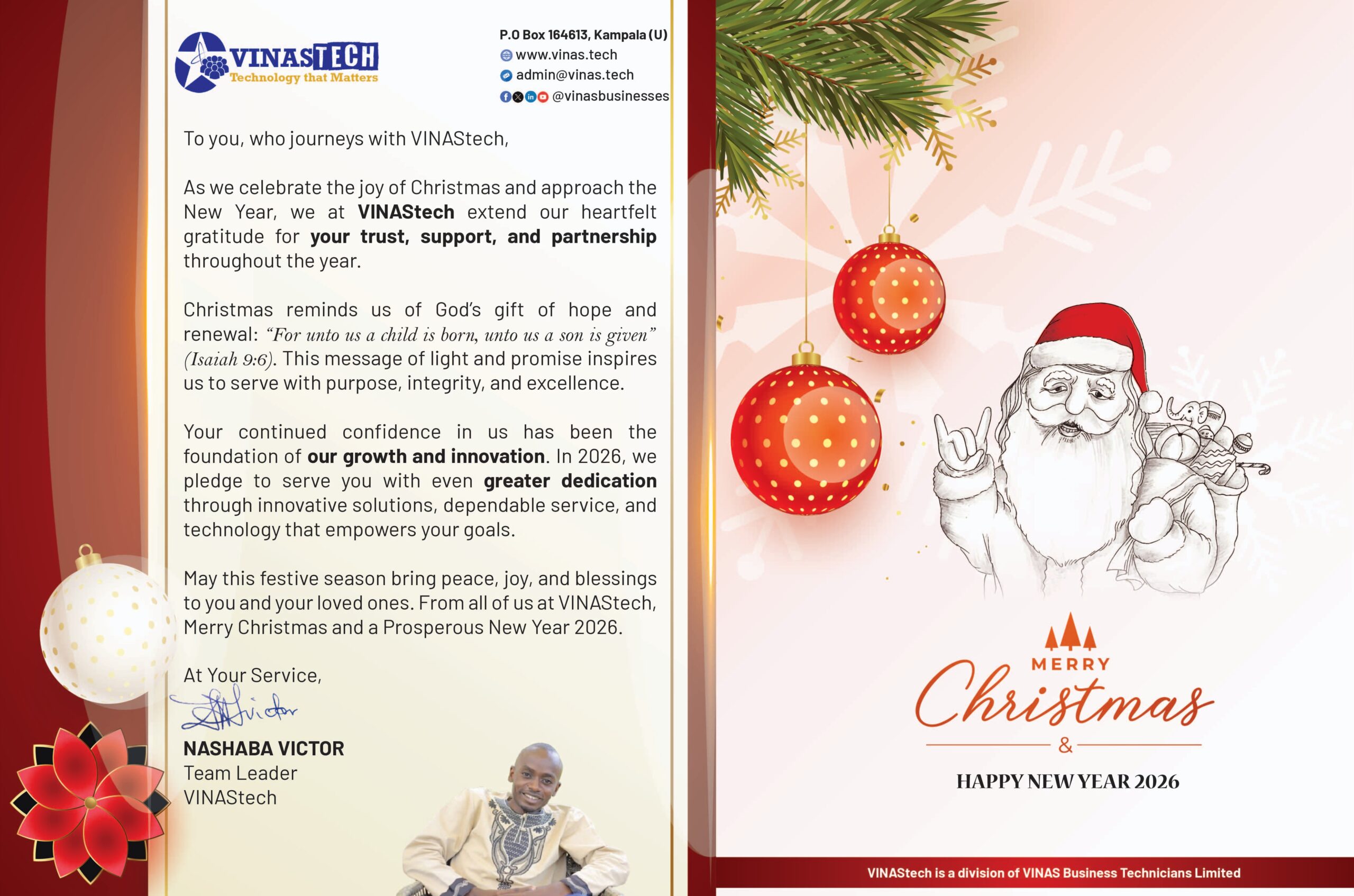 May this festive season bring peace, joy, and blessings to you and your loved ones. From all of us at VINAStech, Merry Christmas and a Prosperous New Year 2026.
